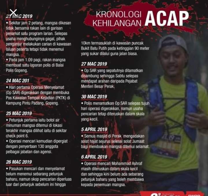 Masih ingatkah anda dengan kisah Mohammad Ashraf atau Acap yang hilang ketika menyertai sebuah larian di Gopeng, Perak pada Mac tahun lalu? Kisah itu antara yang menggemparkan pada tahun lepas. Sehingga kini, Acap masih belum ditemui dan kehilangannya kekal misteri.